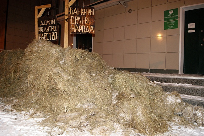 По словам представителя МВД по Новосибирской области, сообщение о появившейся около отделения Сбербанка навозной куче полиция получила 13 февраля утром. Оказалось, что фермер непосредственно у входа в банк рассыпал навоз, установив тут же два плаката с надписями: «Банкиры враги народа» и «Долой кредитное рабство». В настоящее время по данному факту проводятся проверочные мероприятия.