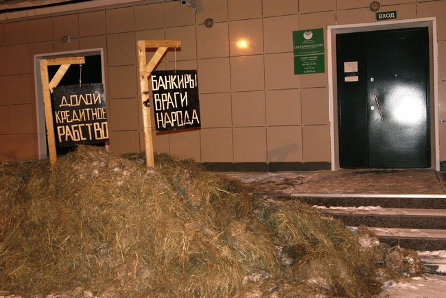 По словам представителя МВД по Новосибирской области, сообщение о появившейся около отделения Сбербанка навозной куче полиция получила 13 февраля утром. Оказалось, что фермер непосредственно у входа в банк рассыпал навоз, установив тут же два плаката с надписями: «Банкиры враги народа» и «Долой кредитное рабство». В настоящее время по данному факту проводятся проверочные мероприятия.